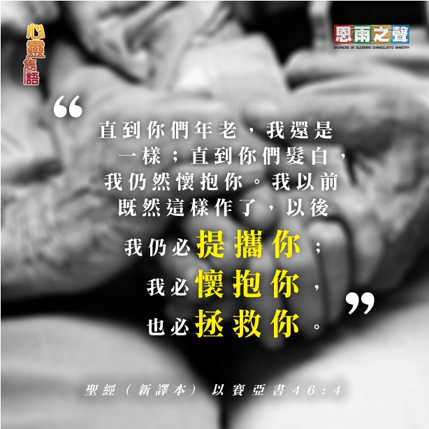 “直到你們年老,我還是一樣;直到你們髮白,我仍然懷抱你。我以前既然這樣作了,以後我仍必提攜你;我必懷抱你,也必拯救你。” — 以賽亞書46:4